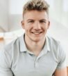 Two people wearing masks are engaged in cleaning activities outside a building with large windows. One person is pushing a line of shopping carts, while the other is sweeping the ground with a broom. The background consists of a paneled wall and a window with visible reflections.